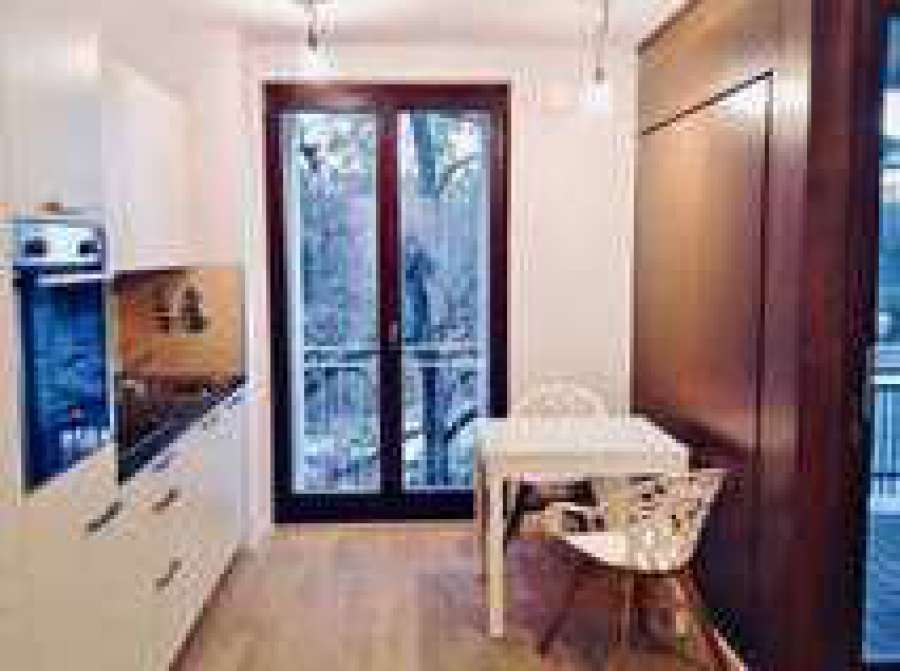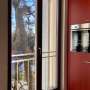 Hell und lichtdurchflutet durch bodentiefe Flügeltüren mit weißen Klappläden von außen! Das besondere an diesem Appartement, die wohnliche Loggia mit Holzboden hat an zwei Seiten eine Schiebetür. Damit öffnen Sie noch mehr den Wohnraum und leben an der frischen Luft. Die Wohnung ist teilmöbliert, Einbauküche von deutschem Markenhersteller, Markengeräten u.a. von Neff, vierflammiges Cerankochfeld, Backofen, Geschirrspüler, Kühlschrank, Schränke für Kleidung, Garderobe, 1 Esstisch, 2 Stühle.