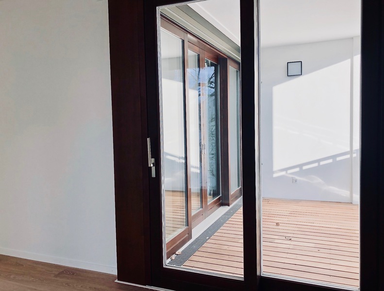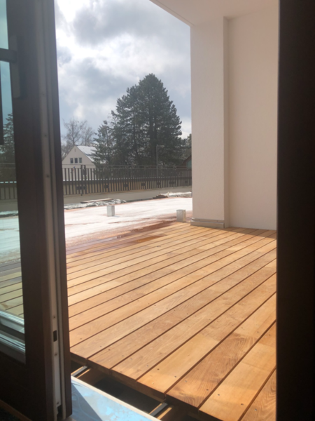 Das besondere an diesen Appartements ist die wohnliche Loggia mit Holzboden im 2. Obergeschoss oder im 1. Obergeschoss mit einer großen Holzterrasse.Jeweils vom Wohn- und Schlafraum betritt man durch eine Schiebetür die Loggia oder die Terrasse. Dort findet der Gärtner Platz für seine Anpflanzungen oder der Sonnenanbeter für seine Relaxliege. Helle, ansprechende Wohnung mit einer Fensterfront von bodentiefen Flügeltüren mir weißen Klappläden von außen. Vom Wohnzimmer und auch vom Schlafzimmer kommen Sie durch eine Schiebetür auf die wohnliche Loggia mit Holzboden/Robinie. Die Wohnung ist mit einer Einbauküche von deutschem Markenhersteller, Markengeräten u.a. von Neff, vierflammiges Cerankochfeld, Backofen, Geschirrspüler, Kühlschrank ausgestattet.